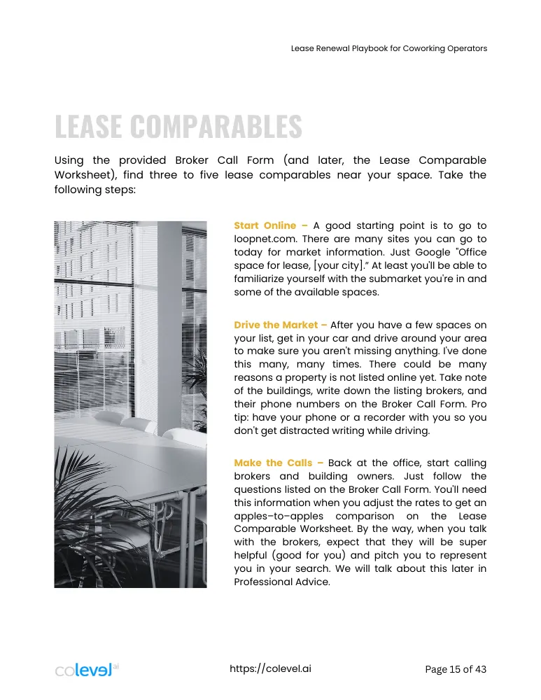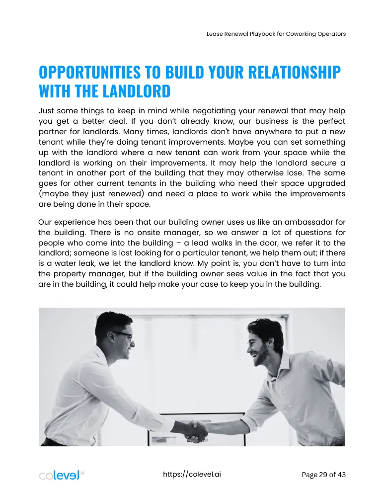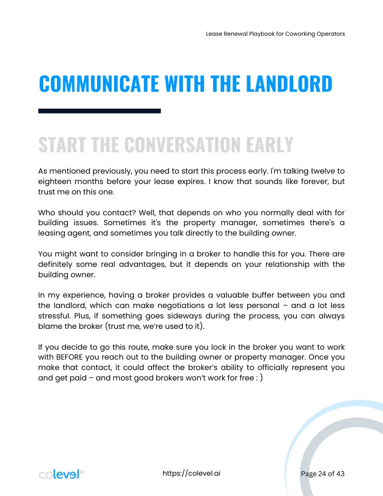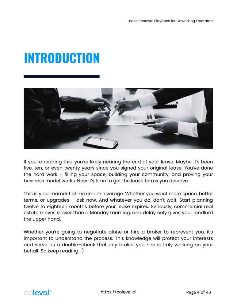 We do run CoLevel—a lead management platform for coworking operators. When you download this, you'll join our email list and might hear about how CoLevel helps spaces like yours. If you're reading about lease renewals, you're probably the type of operator we built it for.